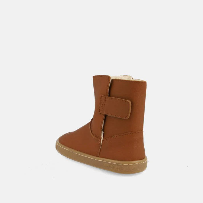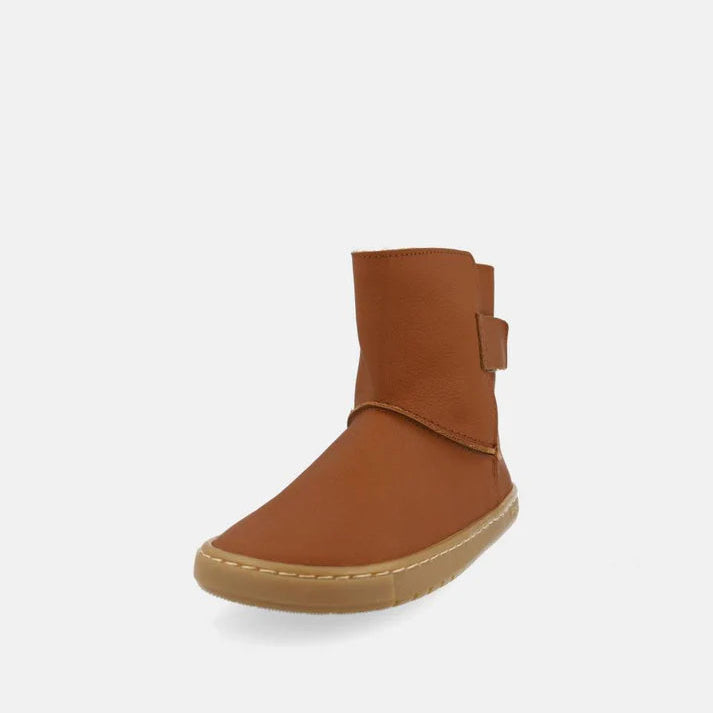 La bota HIELO de BLANDITOS, confeccionada en cuero serraje, combina durabilidad y confort. Cuenta con un cierre de velcro interior a tono, que facilita la colocación y mejora la autonomía de los niños. Su interior forrado en borreguillo ofrece calidez y suavidad. La suela de caucho color miel, amplia, plana y con drop cero, garantiza máxima flexibilidad y un soporte estable, favoreciendo el desarrollo natural del pie.