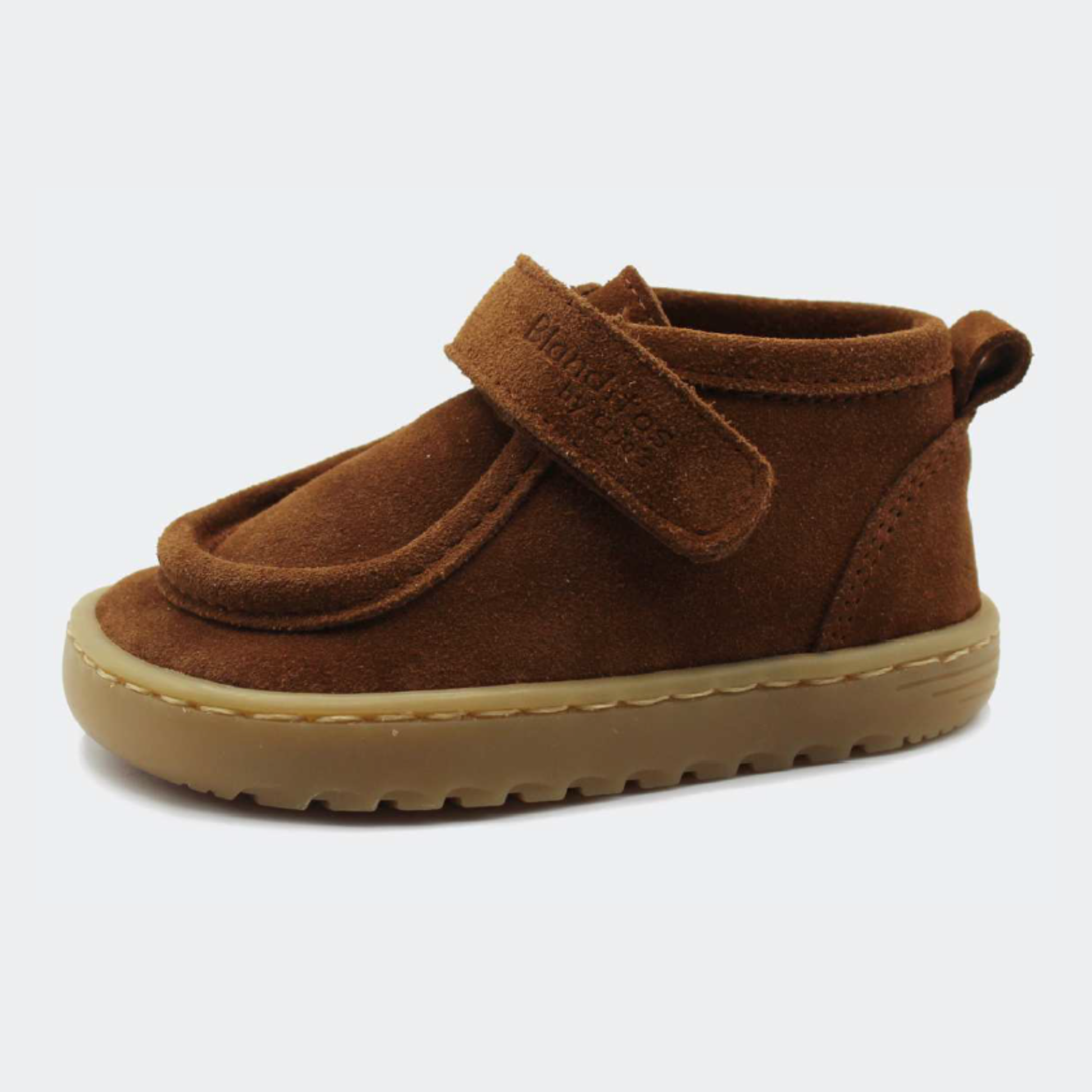 La botita Sahara de Blanditos está confeccionada en piel serraje, con plantilla y forro de microfibra que garantizan comodidad y transpirabilidad. Su cierre de velcro facilita el ajuste y la suela de caucho natural aporta adherencia respetando el entorno. Diseñada con una horma amplia en la zona de los dedos, permite el crecimiento natural del pie infantil sin restricciones. No cuenta con puntera reforzada, por lo que no es recomendable para actividades con fricción intensa como correpasillos o gateo, protegiendo así la integridad del cuero.