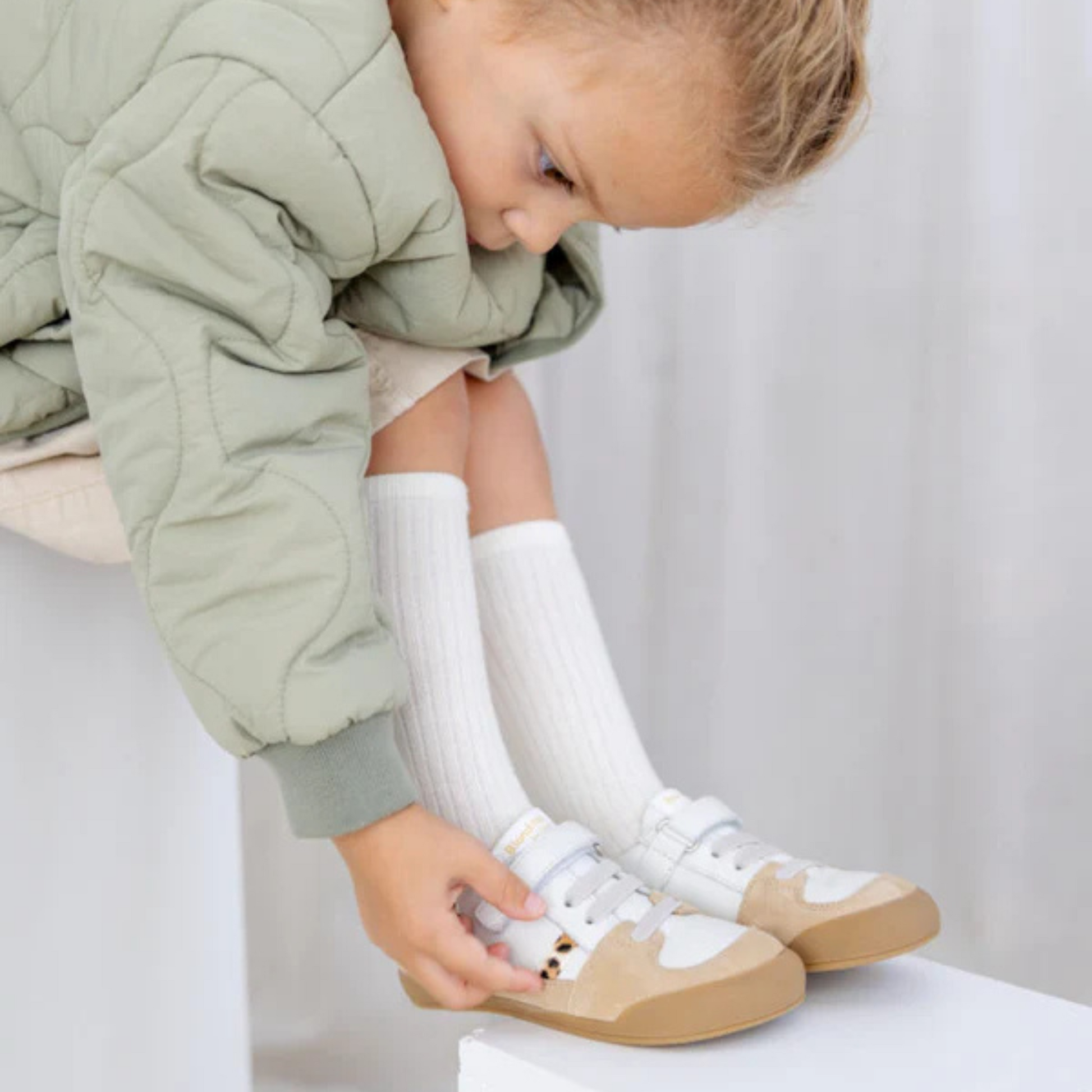 El modelo NEPAL están confeccionados con piel tanto en la parte superior como en el interior, garantizando comodidad y durabilidad. Su cierre combina velcro y cordones elásticos, facilitando que los niños puedan ponerse los zapatos de forma autónoma. La suela ancha de caucho marrón es plana, sin drop, muy flexible, favoreciendo el desarrollo natural del pie durante los primeros pasos.