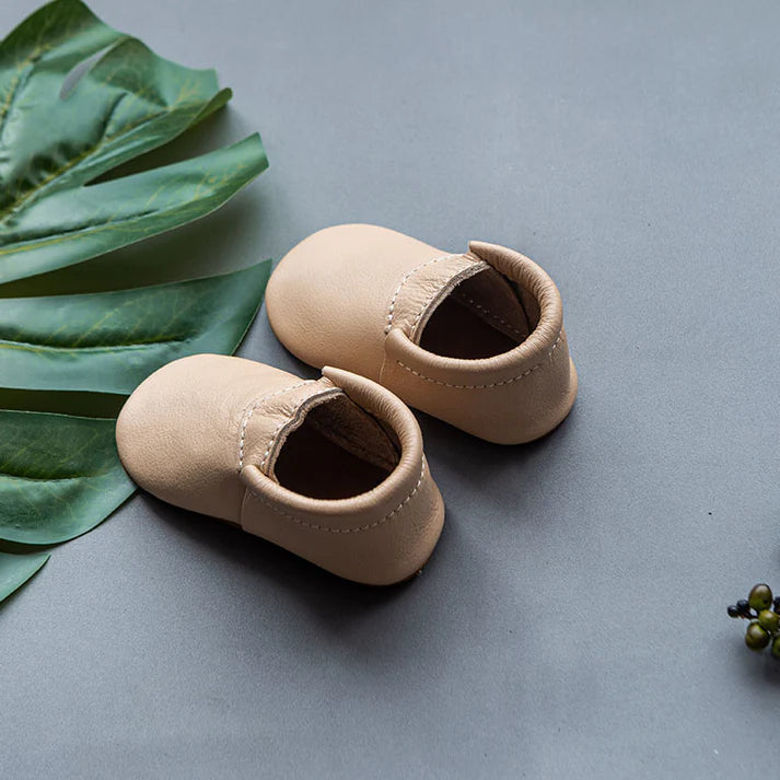 Los Mocs MINIMOX - CITY BEIGE están diseñados ergonómicamente para acompañar a tu bebé en cada etapa: gatear, caminar, correr y jugar con total libertad. Fabricados a mano con piel natural vacuna 100%, son hipoalergénicos, frescos en verano y cálidos en invierno, evitando sudoración y malos olores. Su suela blanda de piel Nobuck antideslizante garantiza seguridad y durabilidad. El elástico en la abertura facilita su colocación y asegura que permanezcan en el pie. Ideales para bebés y niños pequeños, cada par es una pieza única creada con dedicación artesanal.