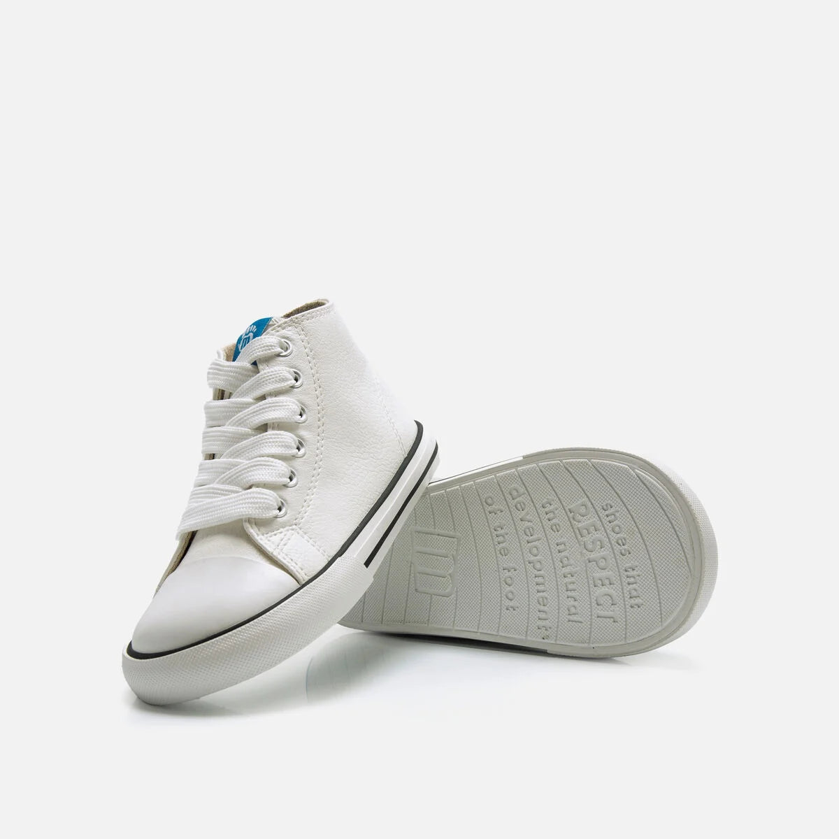 Las zapatillas abotinadas MTNG Free en blanco combinan diseño casual y funcionalidad para el uso diario infantil. Su caña media y cierre lateral con cremallera facilitan el calce, mientras que los cordones permiten un ajuste clásico y seguro. Desarrolladas en colaboración con el Dr. Juanjo López, traumatólogo deportivo e infantil, respetan el desarrollo natural del pie. La puntera ancha favorece el movimiento libre de los dedos, y las plantillas extraíbles permiten verificar la talla adecuada. Su fácil apertura ayuda a que los niños puedan ponerse y quitarse el calzado con autonomía. Disponibles de la talla 27 a la 34.