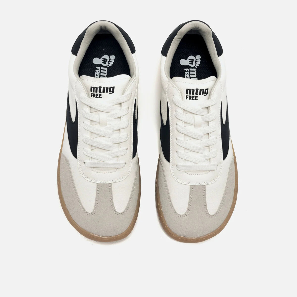 Zapatillas de color blanco para hombre, modelo Free Jym de Mustang. Combina paneles blancos con detalles negros en los laterales y talón, y un refuerzo en la puntera en tono gris claro. La suela marrón de acabado texturizado aporta un toque vintage a este diseño de inspiración retro. Diseñadas y desarrolladas especialmente en colaboración con el Dr. Juanjo López, traumatólogo deportivo, para respetar el desarrollo natural del pie. Se trata de un calzado minimalista que gracias a su puntera ancha, suela totalmente plana (cero drop) y flexibilidad, mejora la anatomía del pie y favorece una mejor posición del mismo. Se vende con una plantilla de transición para hacer el cambio de calzado convencional a minimalista de manera progresiva. Con certificado VEGANO sellado por INESCOP, el cual garantiza que la naturaleza química principal del material no se corresponde con fibras de origen animal.